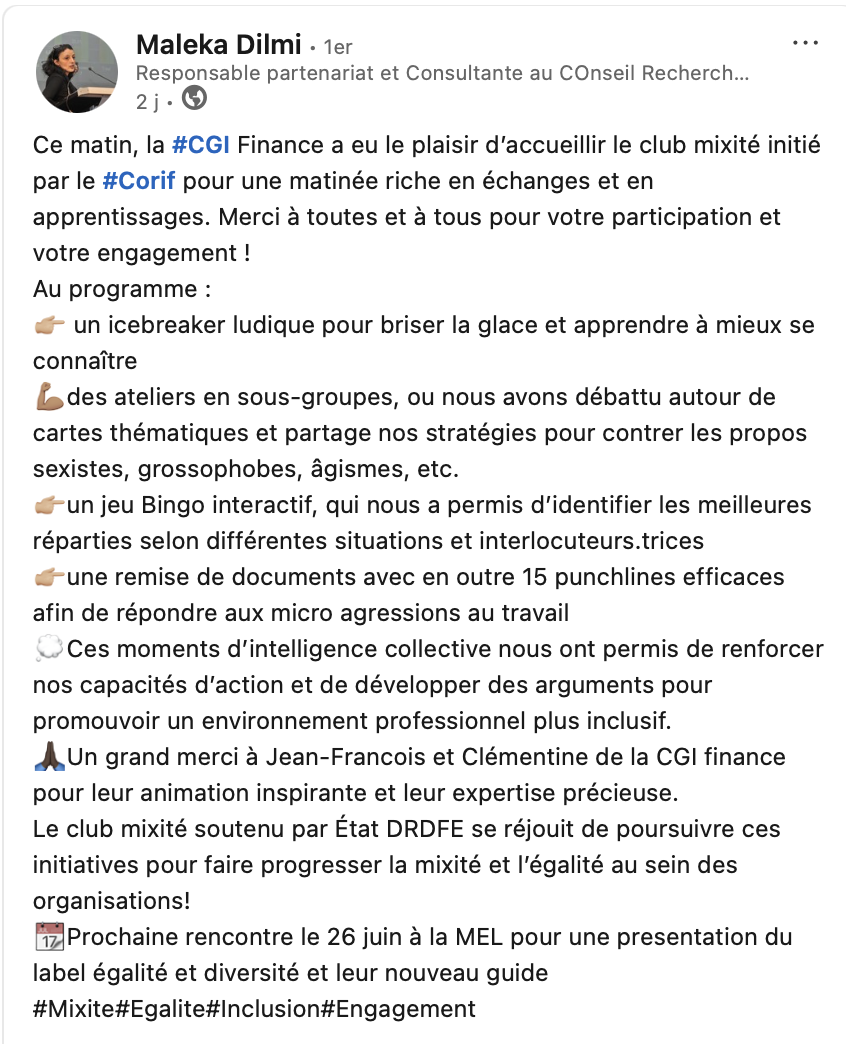 Une matinée riche en bonnes pratiques et en échanges avec les différents membres du Club Mixité. La MEL nous a accueilli dans ses locaux pour partager et échanger sur leur politique interne en matière de lutte contre les discriminations, en faveur de l'égalité femmes-hommes et sur la prévention des violences sexistes et sexuelles au travail.
